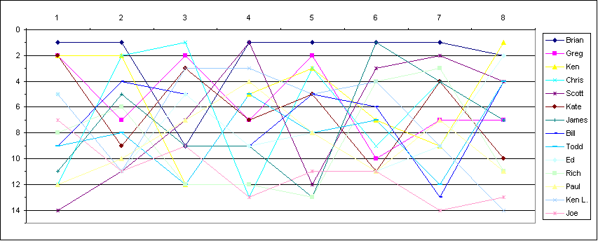 | 13 | Ken L. | 5 | 26 | 11 | 20 | 3 | 27 | 3 | 28 | 5 | 25 | 4 | 26 | 9 | 23 | 14 | 0 | 175 | ||
